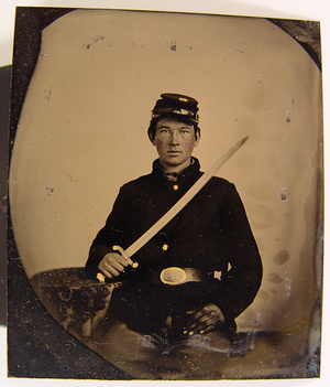 Unidentified soldier in Union uniform with cavalry saber and cap box