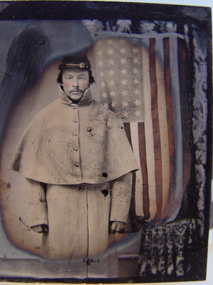 Unidentified soldier in Union uniform with greatcoat in front of American flag