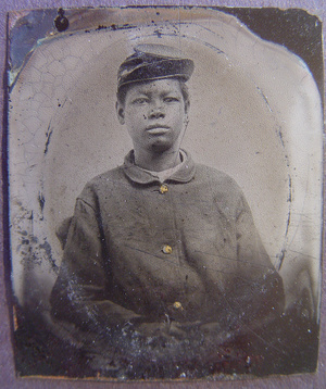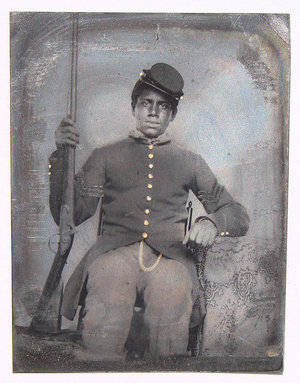 Unidentified African American soldier in Union sergeant uniform holding a rifle