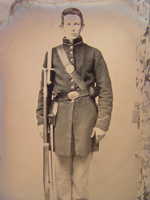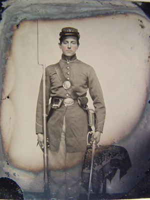Unidentified young soldier in Union uniform and cap and cartridge box with bayoneted musket, bayonet and scabbard, and sword
