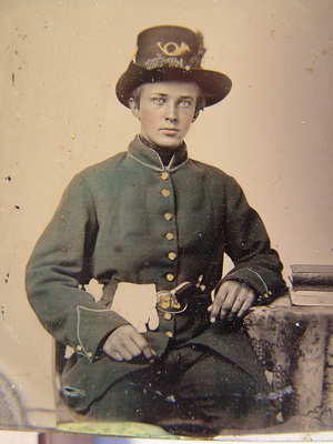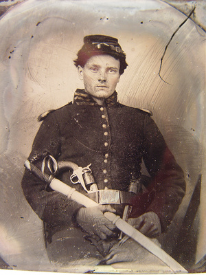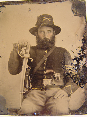 Unidentified soldier in Union cavalry uniform and Hardee hat with European import saber and French LeFaucheux pinfire revolver