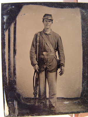 Unidentified soldier in Union uniform and eagle breast plate with bayoneted musket, cap box, and bayonet scabbard