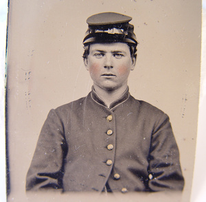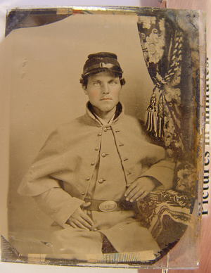Unidentified soldier in Union uniform with greatcoat and Hardee hat