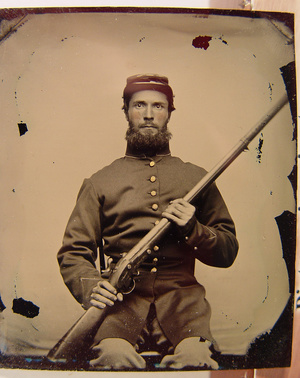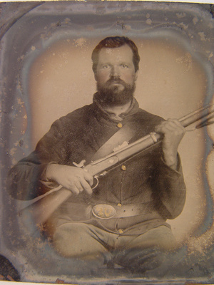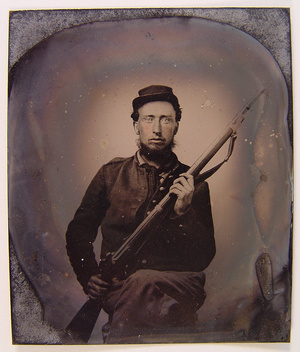 Unidentified soldier in Union frock coat with musket and attached sword bayonet