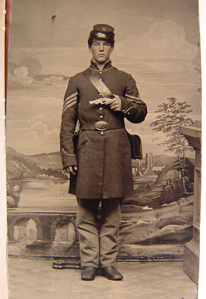 Unidentified soldier in Union sergeant's uniform standing with revolver and cartridge box in front of painted backdrop showing countryside landscape