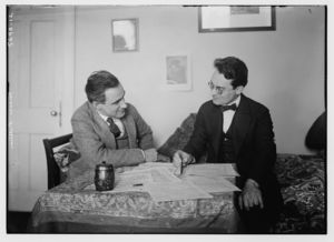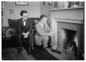 Two unidentified young women wearing printed dresses and necklaces in front of painted backdrop showing plantation