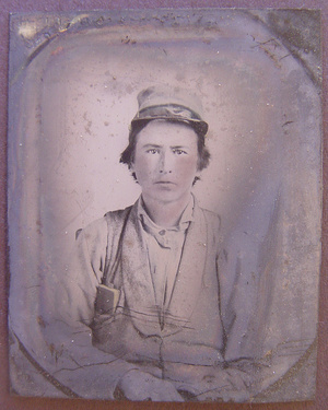 Unidentified young soldier in Confederate kepi and vest with small book in pocket, possibly a Bible