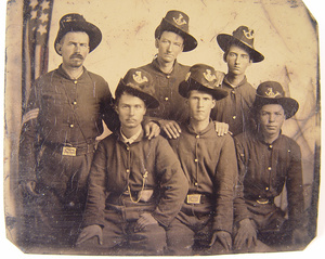 Unidentified infantry sergeant in Union uniform with five young infantry soldiers with American flag at side