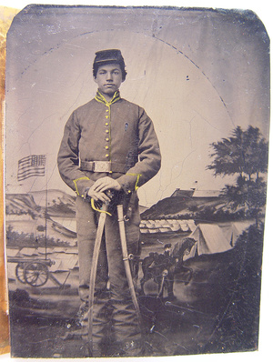 Unidentified young soldier in Union shell jacket with cavalry markings and kepi cap holding cavalry saber