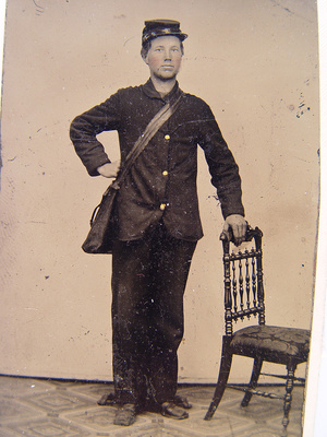 Unidentified young soldier in Union courier uniform and forage cap with haversack