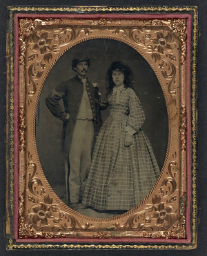 Unidentified soldier in Union sergeant's frock coat and forage cap with unidentified woman in dress and hat with veil