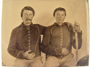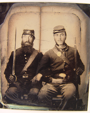 Two unidentified soldiers in Union uniforms and forage caps with saber and musket