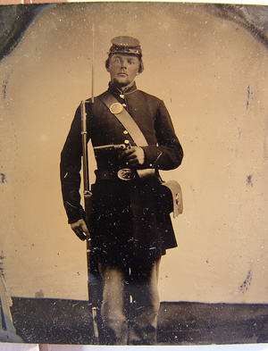 Unidentified soldier in Union frock coat and forage cap with bayoneted musket and revolver