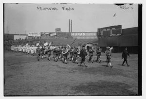Band and players march for Giants' home opener, Polo Grounds, New York (baseball)