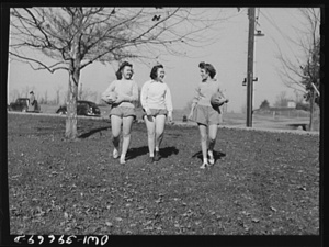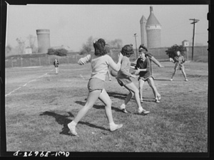 Washington, D.C. Sally Dessez (on right), a student at Woodrow Wilson High School, returning from playing field hockey after her gymnasium class