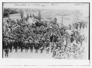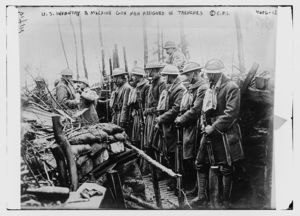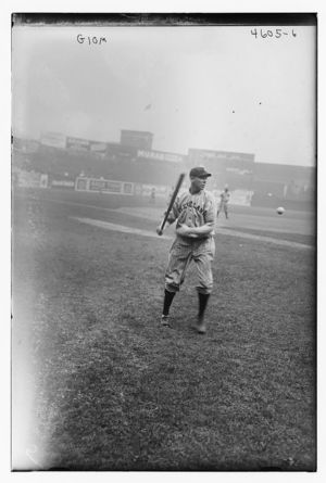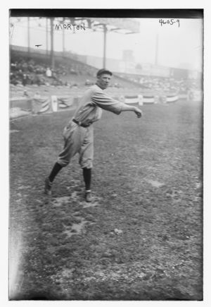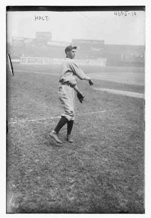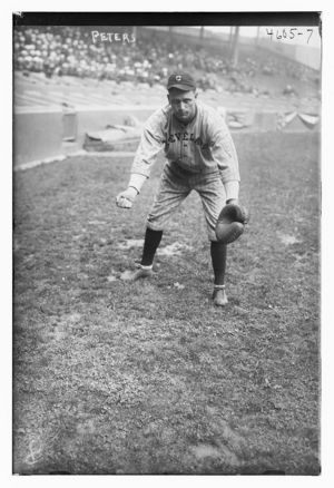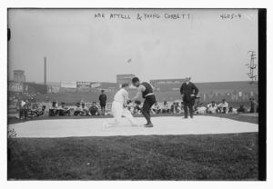 Joe Welling, boxer amid Cleveland baseball players in stadium, 1918