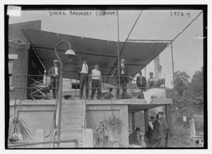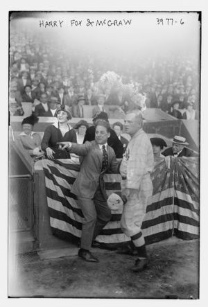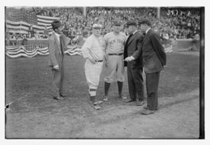 John McGraw, manager, New York NL & Wild Bill Donovan, manager, New York AL with two umpires (baseball)