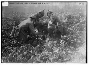 German Sanitary Corps & wounded man in Belg. i.e., Belgium