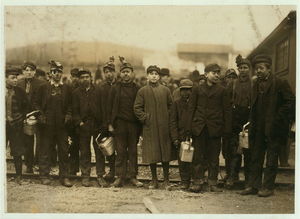 Group of boys working in #9 Breaker Pennsylvania Coal Co, Hughestown Borough, Pittstown, Pa. In this group were Sam Belloma, Pine Street, Angelo Ross, 142 Panama Street, and others (reported previously). Location: Pittston, Pennsylvania.
