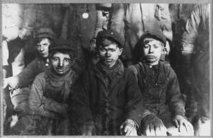 Four Breaker Boys working in #9 Breaker, Hughestown Borough. Boy on left is Tony Ross, 142 Panama Street, other small boy is Mike Rosa i.e., Ross?, cousin. Location: Pittston, Pennsylvania.