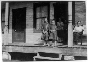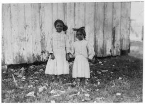 Mildred Kron, three years old, and Gertrude Kron, five years old. Help shuck oysters every day in the Barataria Canning Co. Live in New Orleans, (See also photos 1973, 1976, 1977, 1997, 1998.) Location: Biloxi, Mississippi.