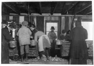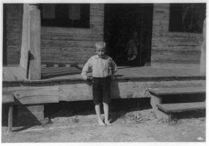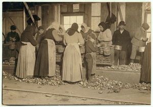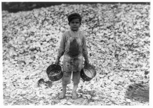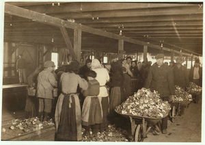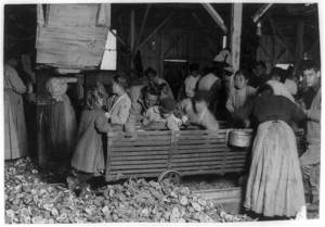 Small boy on the floor is Johnnie Schraker, 8 years old, earns 45 cents a day, been at it three years. Note how they stand on the rough, sharp shells. Alabama Canning Co.,. Location: Bayou La Batre, Alabama.