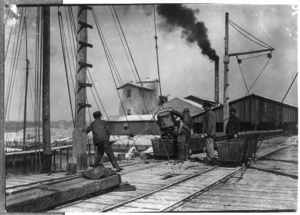 Unloading oysters on the dock. Alabama Canning Co.,. Location: Bayou La Batre, Alabama.