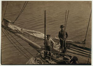 Alfred and Willie, two young oyster fishers in Mobile Bay. A few, but not many of these youngsters are found on the oyster boats. Location: Bayou La Batre, Alabama.