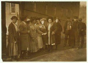 Group of workers at Dwight Mfg. Co. Gottlieb Gasnick, (boy with sweater), 15 Gardner Rd. Worked in spinning room #4 for six months. Location: Chicopee, Massachusetts.