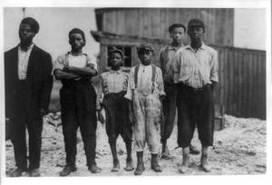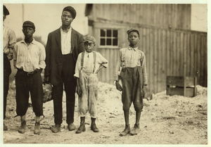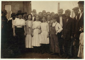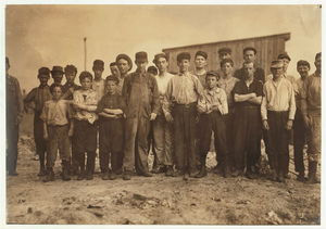 Group of workers, including boys and girls, standing outdoors