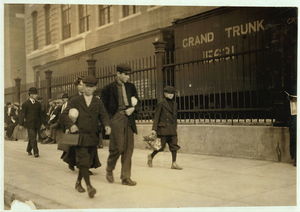Shots at the young workers going to Ayer Mill, 6:30 to 7 A.M. All work. Location: Lawrence, Massachusetts.