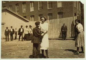Sarah Nelson, County Street, (over grocery store) Arthur Sarasin (see 2286). Sarah is 14 years old. Location: New Bedford, Massachusetts.