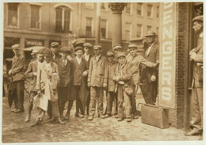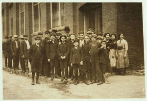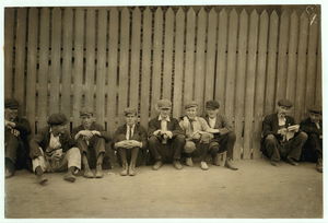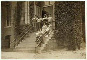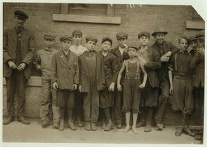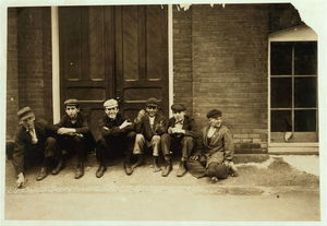 Group of workers in Eclipse Mills. Second boy from right was afraid to give name. Location: North Adams, Massachusetts.