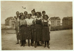 A group of workers in the Butler Mills. Kate McCormick, 10 Cleveland St. The smallest girl in the picture. Apparently 13 years old. The happy faces appear only when the photo is being taken. Location: New Bedford, Massachusetts.
