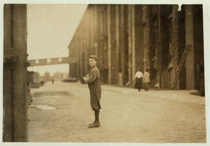 Young worker leaving mill of Sagamore Manufacturing Company, Fall River, Mass., August 26, 1911. Noon. Richard K. Conant, Witness. Location: Fall River, Massachusetts.