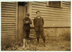 Joseph Crapo, 47 Fruit St., works in Eclipse Mills. Apparently 13 years old. Right hand. Left hand, Albert Duquette, 183 Union St. works in weave shed, putting drop wires on weave machine. Location: North Adams, Massachusetts.