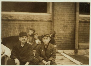 While I was photographing these workers (Berkshire Mills) the watchman dragged out the smallest boy, saying, "Here, photograph 'Peewee'." Location: Adams, Massachusetts.