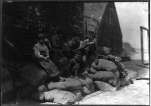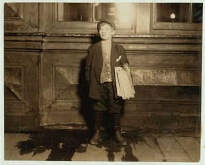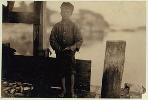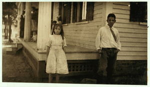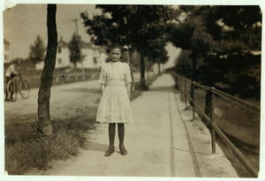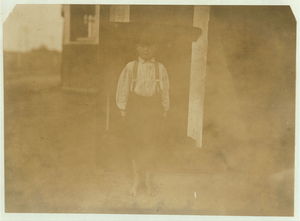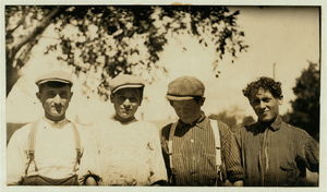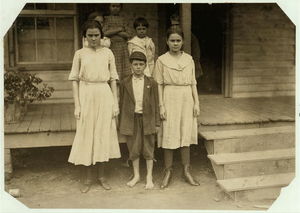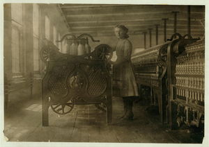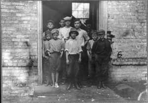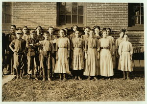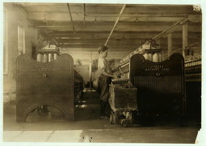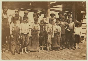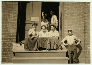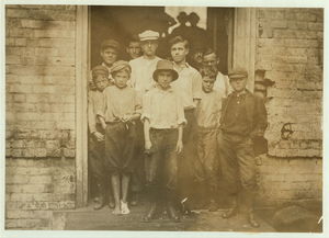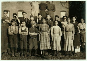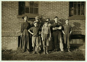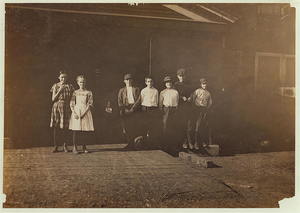 Group of Workers in Glenallen Mill, including Adrienne Pagnette, Annie Dugas, Francis Pagnette, Anatole Gernon, apparently 11 or 12 years old, doffs on top floor spinning room of the above mill. Speaks no English. Location: Winchendon, Massachusetts.