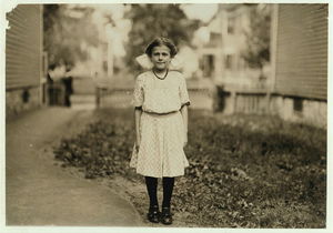 Antoinette Pothier, been doffing six months at Ayer mill. Has a walk of nearly 30 minutes each way to work morning and night. Leaves home at 6 A.M. and gets back 6:30 P.M. Location: Lawrence, Massachusetts.