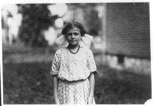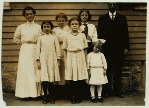 All of the family of Antoinette Pothier, 32 Easton Street. Father and tallest girl in back row of the picture work. Antoinette is the center of the group in the front row. Her sister Anita is 11 years old. See 2477. Location: Lawrence, Massachusetts.