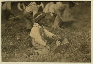 Boy of 12 years picking cranberries with the scoop. Most of the scooping is done by adult workers, but some scoops ? are made small enough for the children to use. Location: Hollow Branch Bog, near Wareham, Massachusetts.