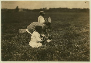 Mamie, who said she was 9 and a regular picker was teaching her 6 year old sister Ada to use a scoop. Location: Hollow Branch Bog, near Wareham, Massachusetts.