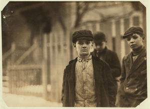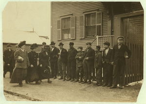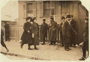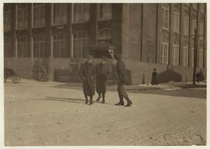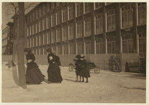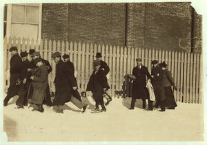 Going home Saturday noon, Jan 6., from Nashawena, Nonquitt and Manomet Mills. Many of these smallest ones said, "Working in these mills." Location: New Bedford, Massachusetts.
