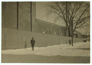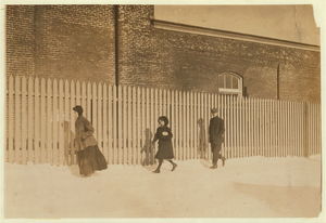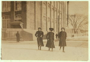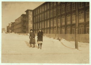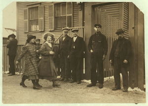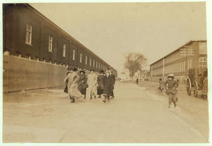 Young workers adolescence and younger in Manomet, Nonquitt and Nashawena Mills. Going to dinner and back to wrk. Noon. January 9, 1912. Richard K. Conand, witness. Location: New Bedford, Massachusetts.