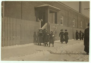 Young workers adolescence and younger in Manomet, Nonquitt and Nashawena Mills. Going to dinner and back to wrk. Noon. January 9, 1912. Richard K. Conant, Witness. Location: New Bedford, Massachusetts