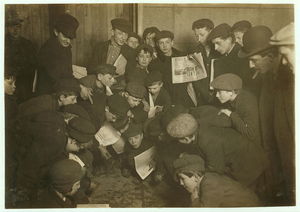 Amusing themselves while waiting for morning papers. Location: New York, New York (State)