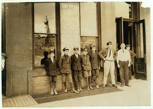 Group of Newsboys on Frankfort Street near World Building. Witness, Fred McMurrry. Location: New York, New York (State) / Photo by Lewis W. Hine.
