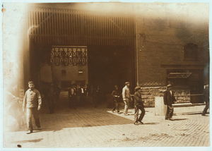 Main entrance, Gary W. Va. Mine. Trapper boy in center. Going to work 7 A.M. will be underground until 5:30 P.M. Trappers are paid $1. per day. Location: Gary, West Virginia.