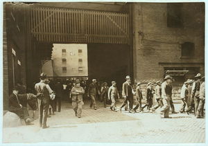 A glass works in Indiana, Night Shift Going to Work. 5 P.M. (See also #115). Location: Indiana.