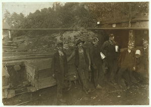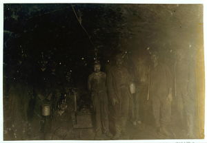 Group of Miners, Drivers and Trapper. Macdonald, W. Va., Mine. Oct., 1908. Witness E. N. Clopper. Location: MacDonald, West Virginia.